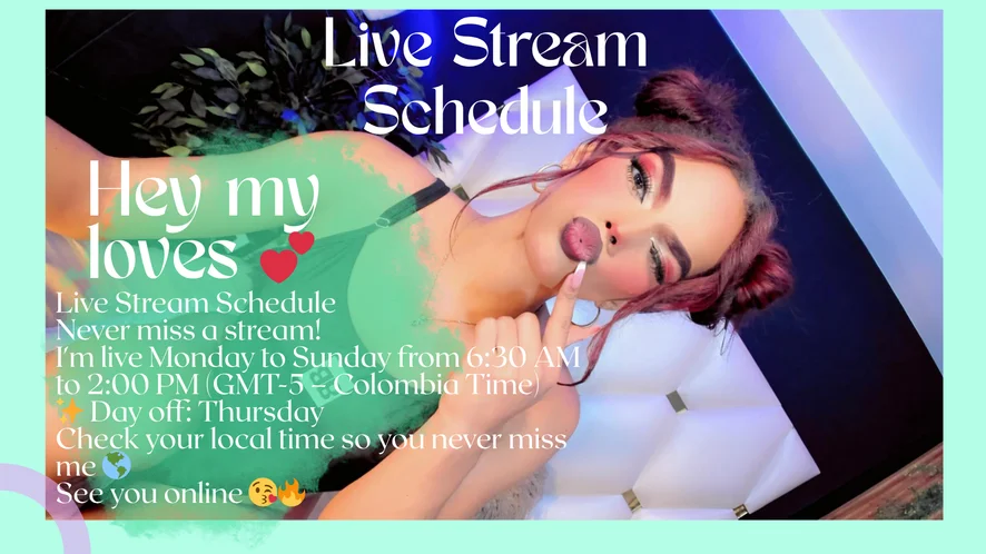 I'm live Monday to Sunday from 6:30 AM to 2:00 PM (GMT-5 – Colombia Time)